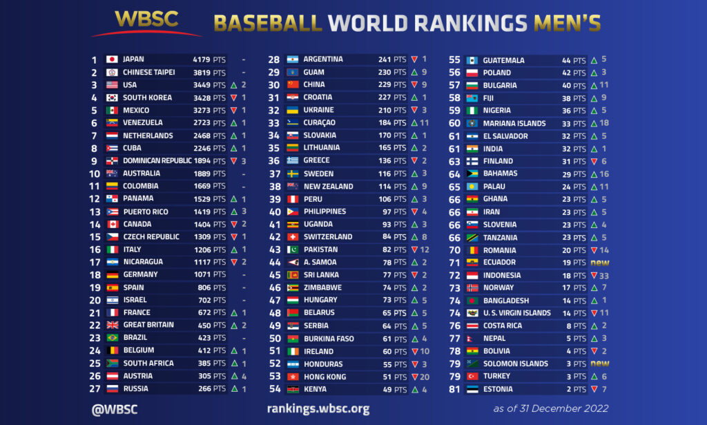 Vid intågandet av 2023 så ser världsrankingen på baseboll herrarnas sida ut som på bilden ovan! Mer information om hur det har rört sig ställningsmässigt i jämförelse mot förra året finner ni här!